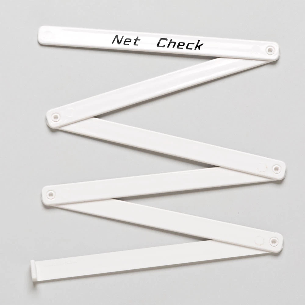 Net Check accurately measures net height. Plastic tool folds for easy bag storage. Very light. Very accurate. Lip at top of tool is designed to rest on net to start the measurement. A great gift item! Note: This net opens to an exact 3′ net height.