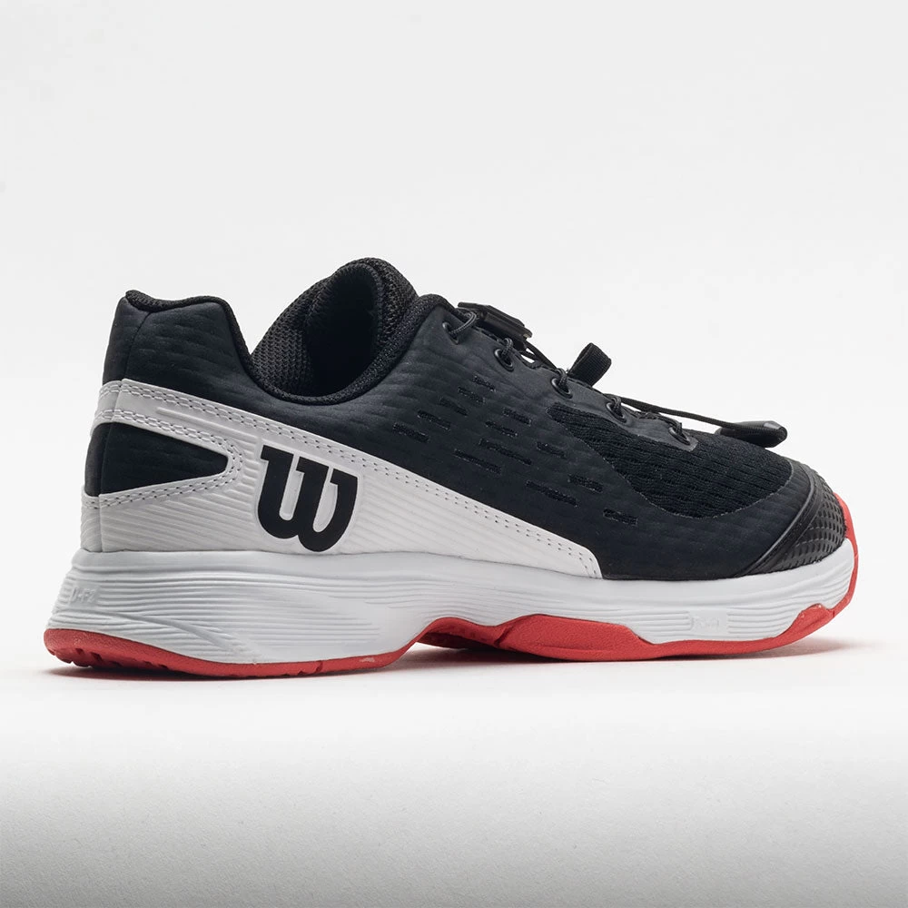 The Wilson Rush Pro 4.0 QL Jr makes it easy to put your shoes on and take them off with Quicklace, a technology that uses one-pull tightening instead of traditional laces. Forefoot support and lightweight arch technology generate added stability and explode into your movement. The Wilson Rush Pro 4.0 QL Jr packages a seamless lacing system with speed and stability for next-level performance.